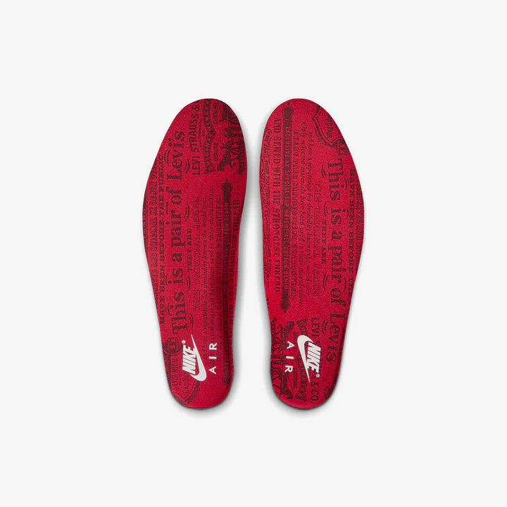 Jordan y Levi's® vuelven a unirse para ofrecer una nueva versión de las AJ3. El denim invertido en color negro y la piel mate premium en la parte superior crean un elegante look oscuro con efecto lavado. La inconfundible etiqueta roja de Levi's® junto a los ojales combina con los detalles en tono gym red de la suela exterior y la plantilla, mientras que el distintivo billete de dólar de Levi’s® completa el look.